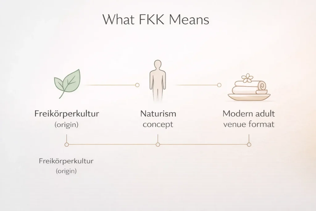 The term FKK originates from “Freikörperkultur,” referring to a naturist tradition. In the context of adult venues, it has evolved into a format where guests and workers interact in a sauna-like environment, often associated with a Vienna sauna club setting.
